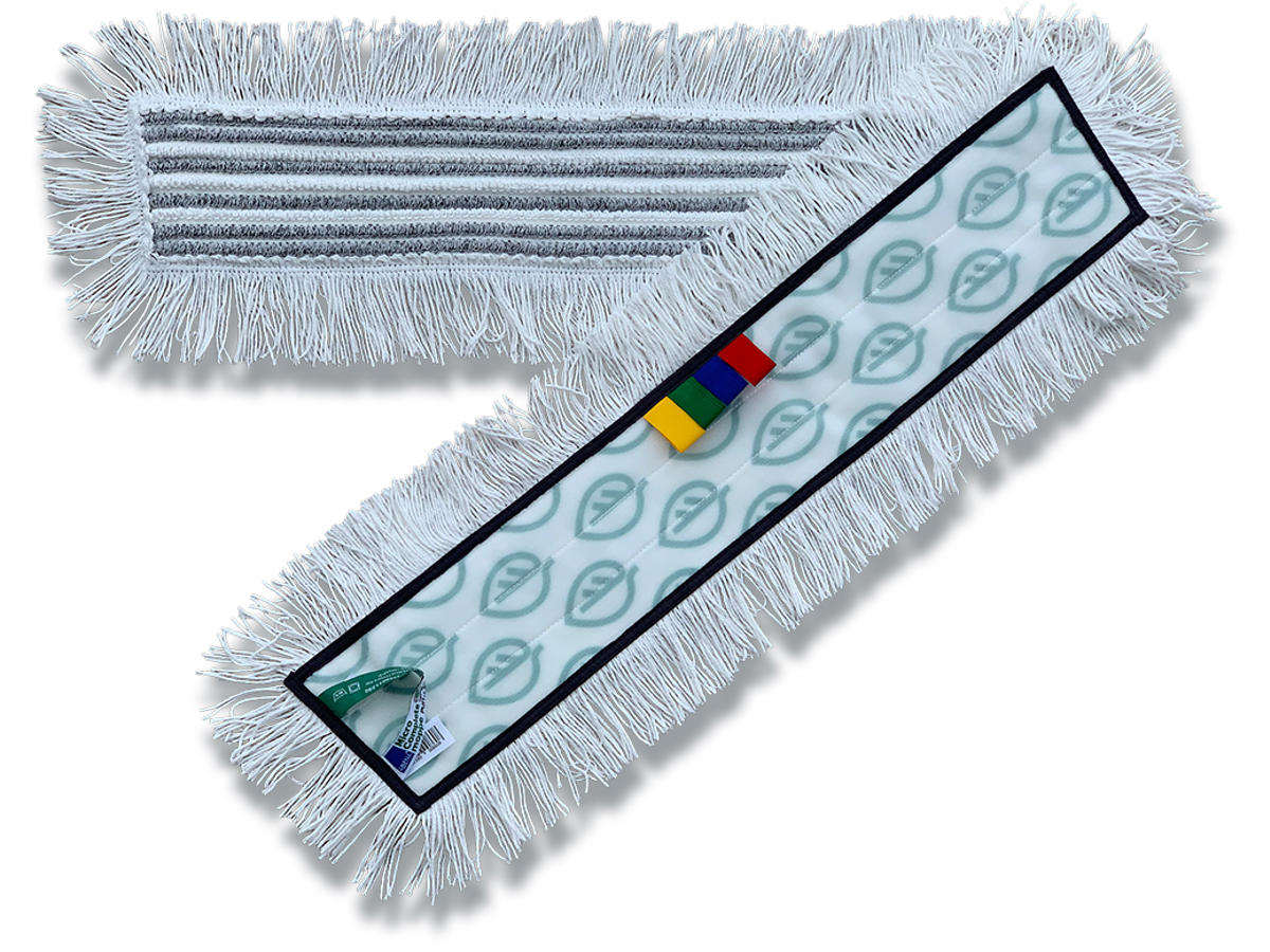 Svanemærket mikrofibermoppe der har dokumenteret bakterieopsamlingsrate på 99,9%. Se testrapport under datablade – øvrige produktinformationer. Hårdt vævet garnmoppe med opskårne kantfrynser, der opsamler snavs langs kanter og ved bord- og stoleben. Den hårde vævning af garnet gør moppen til det oplagte valg til brug på gulve med meget høj friktion. Moppen er særligt effektiv på gulve af laminat, lakeret træ, linoleumsgulv, fliser, epoxy og gummi. Moppen tåler klor, sprit og desinfektion. Kan vaskes ved 95°C. Kan tørretumbles ved 60°C. Undgå brug af skyllemiddel, da det forringer sugeevnen. Tåler op til 500 vaske. Kan krympe op til 2%.