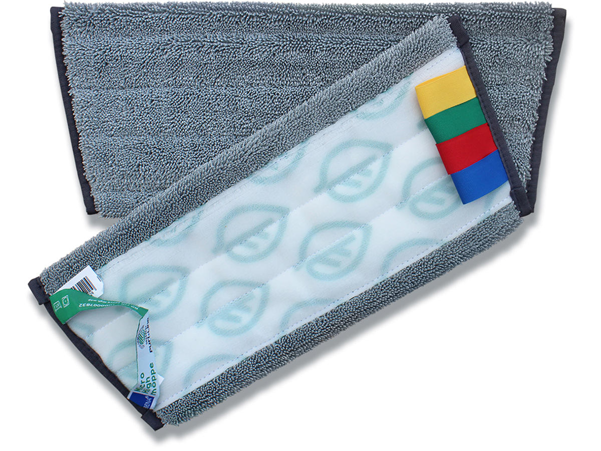 Svanemærket mikrofibermoppe der har dokumenteret bakterieopsamlingsrate på 99,9%. Se testrapport under datablade – øvrige produktinformationer. Moppe til gulvvask, der også kan anvendes som tørmoppe. Moppen er meget effektiv med snoet garn, der giver en særligt virksom luv til opsamling af snavs, jord og grus. Moppen er udstyret med membran, for øget absorbering og dermed større rækkevidde. Særligt velegnet til laminat, lakerede trægulve, granit, linoleum og andre glatte overflader, der tåler vand. Moppen tåler klor, sprit og desinfektion. Kan vaskes ved 90°C, men 70°C anbefales. Kan tørretumbles ved 60°C. Undgå brug af klor og skyllemiddel, da det forringer sugeevnen. Tåler op til 500 vaske. Kan krympe op til 5%. Doser max 1/3 af anbefalet dosering vaskemiddel, da mikrofiber er selvrensende ved 67 grader.
