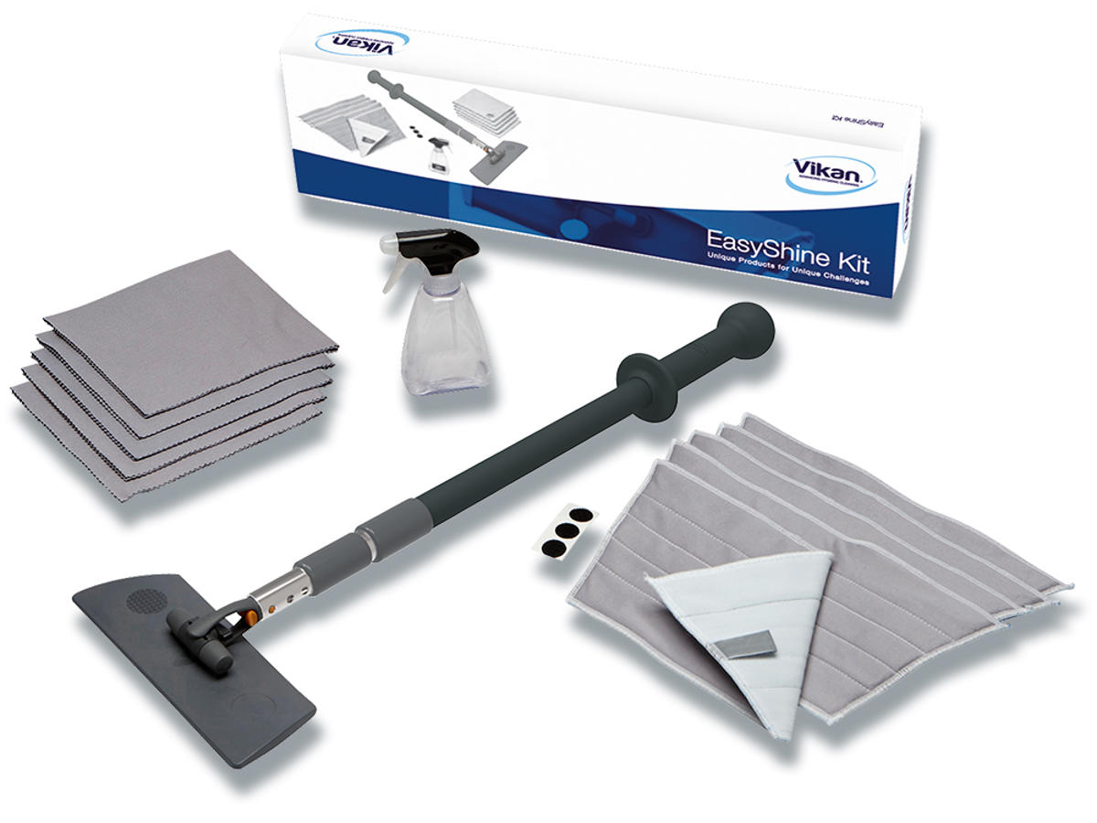 Anvendes til rengøring af vinduer og glaspartier. Sættet indeholder 1 skaft, 1 fremfører, 5 mopper, 5 klude og 1 forstøverflaske.