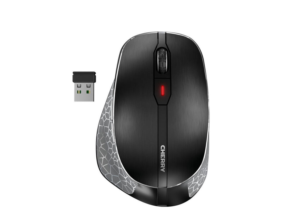 Uncompromising quality, exquisite design, the very latest technol-ogy and the finest materials: These are the ingredients of the CHERRY MW 8C ERGO wireless mouse. The large, ergonomic form is designed for use with the right hand. Even after hours of inten-sive work, it still sits comfortably on the mouse. Mouse buttons made of anodised aluminum pamper the hand with their pleasant feel. Comfort is underlined with rubber-padded side sections, with thumb-rest and trendy Voronoi pattern. The thumb automatically finds a pleasant position and can rest relaxed. Large gliding surfac-es allow the mouse to move lightly over the desktop, relieving stress from the wrist.