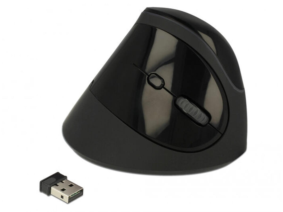DeLOCK 12599. Formfaktor: Højre hånd, Vertikal design. Enhedsgrænseflade: RF trådløst, Bevægelsesopløsning: 1600 dpi, Knapper type: Trykte knapper, Antal knapper: 4, Rulle type: Hjul. Laserfarve: Rød. Strømkilde: Batterier. Fungerer på alle overflader. Produktfarve: Sort
