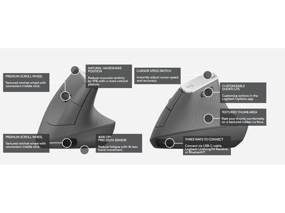 • Logitech MX Vertical Ergonomic Wireless Mouse, Graphite