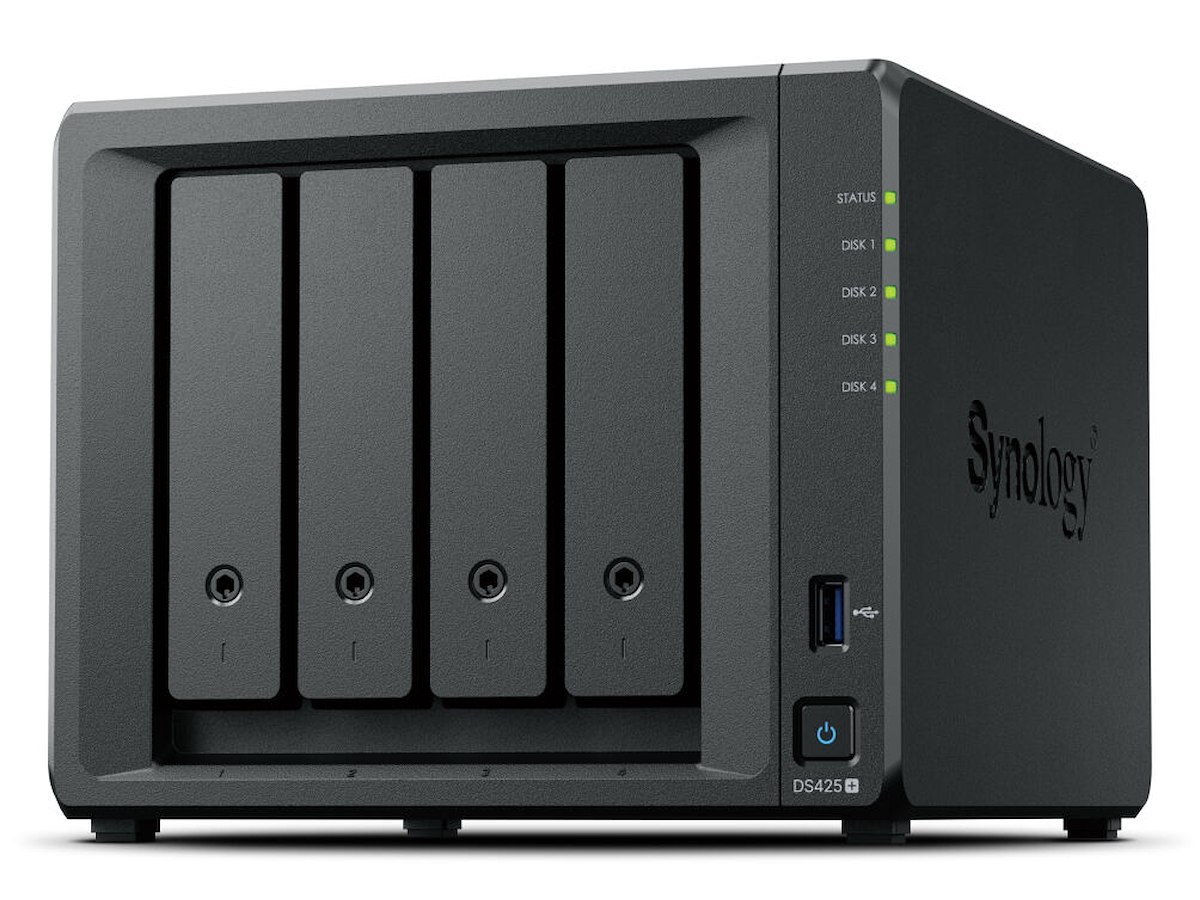 The DS425+ features built-in 2.5GbE networking and supports both SATA SSDs and HDDs in 2.5"/3.5" internal bays, as well as M.2 NVMe drives via M.2 slots for use cache.1,5