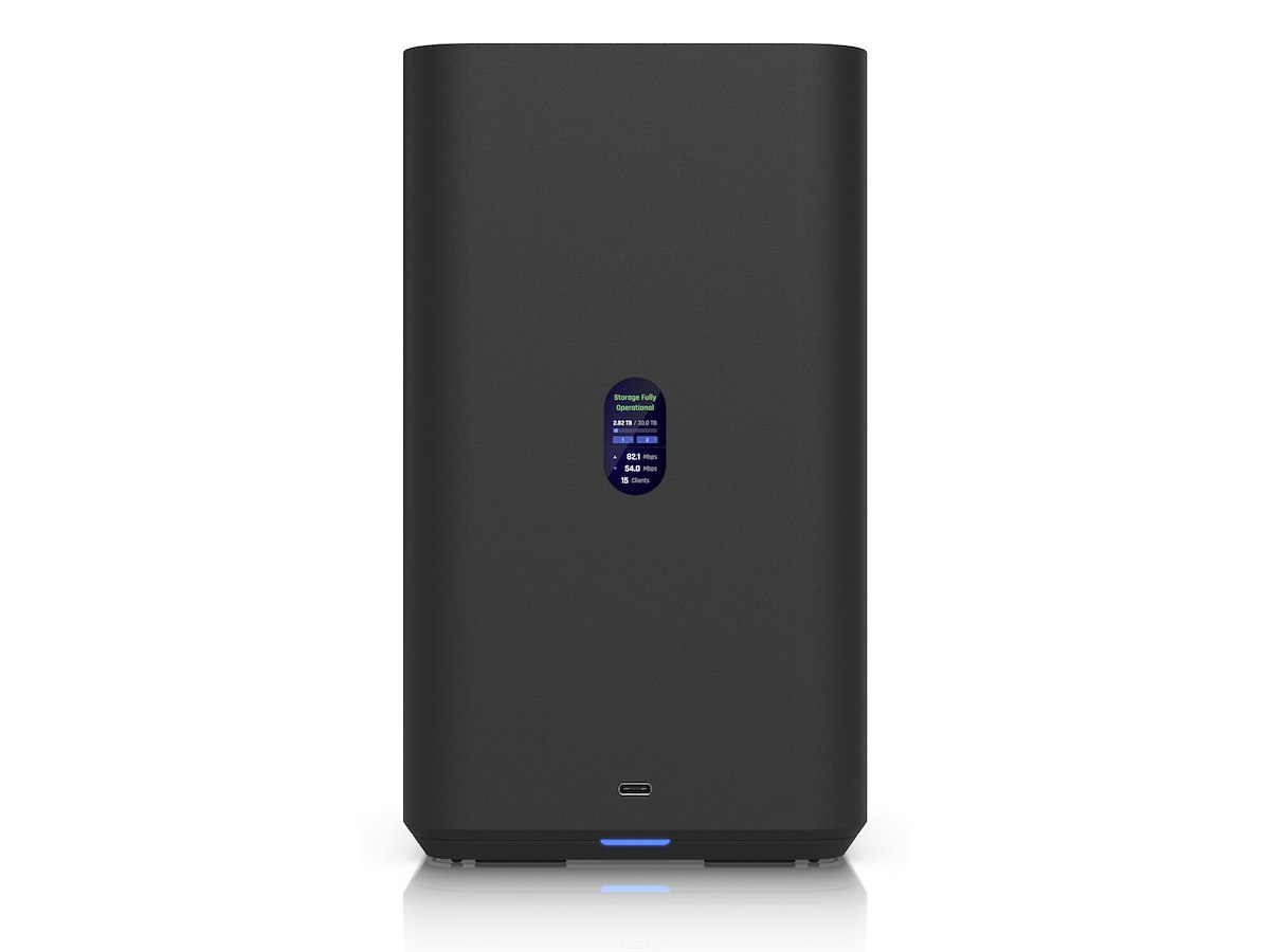 UniFi Network Attached Storage with (2) 3.5" HDD bays, 2.5 GbE networking, USB-C connectivity, and an included PoE++ adapter, all in a compact footprint.