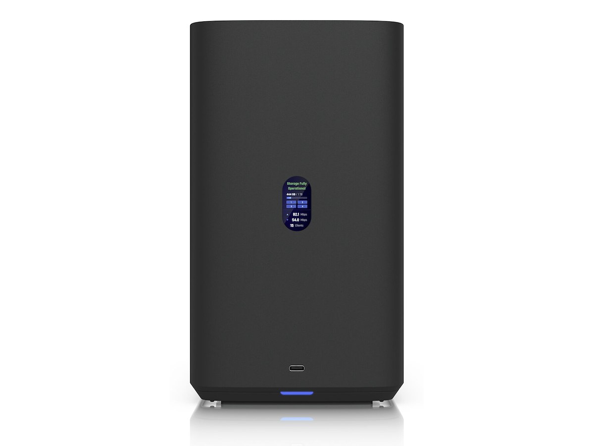 UniFi Network Attached Storage with (4) 2.5/3.5" HDD bays, (2) M.2 NVMe SSD cache slots, 2.5 GbE networking, USB-C connectivity, and an included PoE+++ adapter, all in a compact footprint.