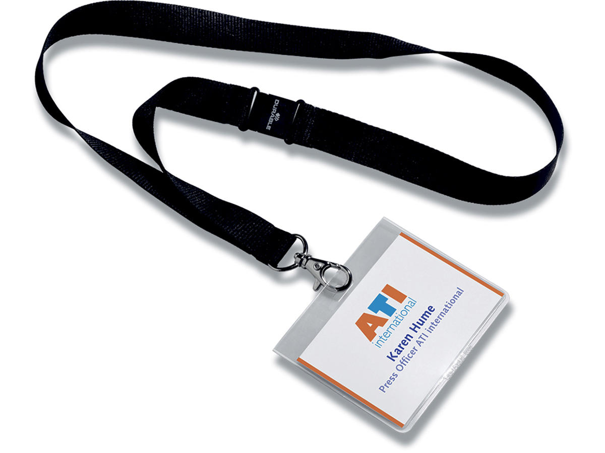 PVC sikkerheds navnebadge og tekstil halsrem. Halsremmen indeholder en sikkerhedsfrigivelse, der åbnes, hvis halsremmen bliver fanget. Fjederlåsen er let at fastgøre til badgen og lukker også badgen sikkert. Med blanke indstik. Størrelse: 60x90mm.