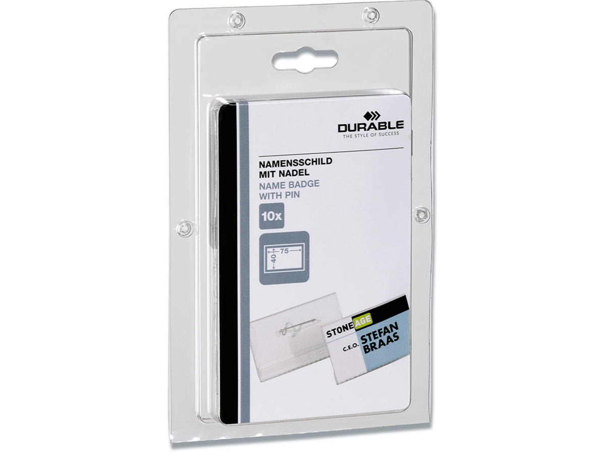 Navneskilt med buet pin, der tillader navneskilt afholdt i position. Nålespidsen er skjult for at forhindre skader på tøj. Enkelt at udskifte navneetiketter ved hjælp af tommegreb. Indstik medfølger. Mål indstik: 40x75mm (HxB). Indstiksetiket på A4 ark til udskrivning i printer kan bestilles separat (Durable art nr 145302). Design selv en personlig designet kongresmærke med gratis skabelon - Klik her