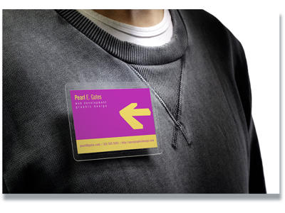 Selvlaminerende kongresmærke i pp-plast med selvklæbende nål/klemme. For at forsegle, fjernes den beskyttende film fra den selvklæbende forside, indsæt visitkortet ved at trykke godt ned. Til visitkort og kort op til 54x90mm (HxB). Kan anvendes både liggende og stående.