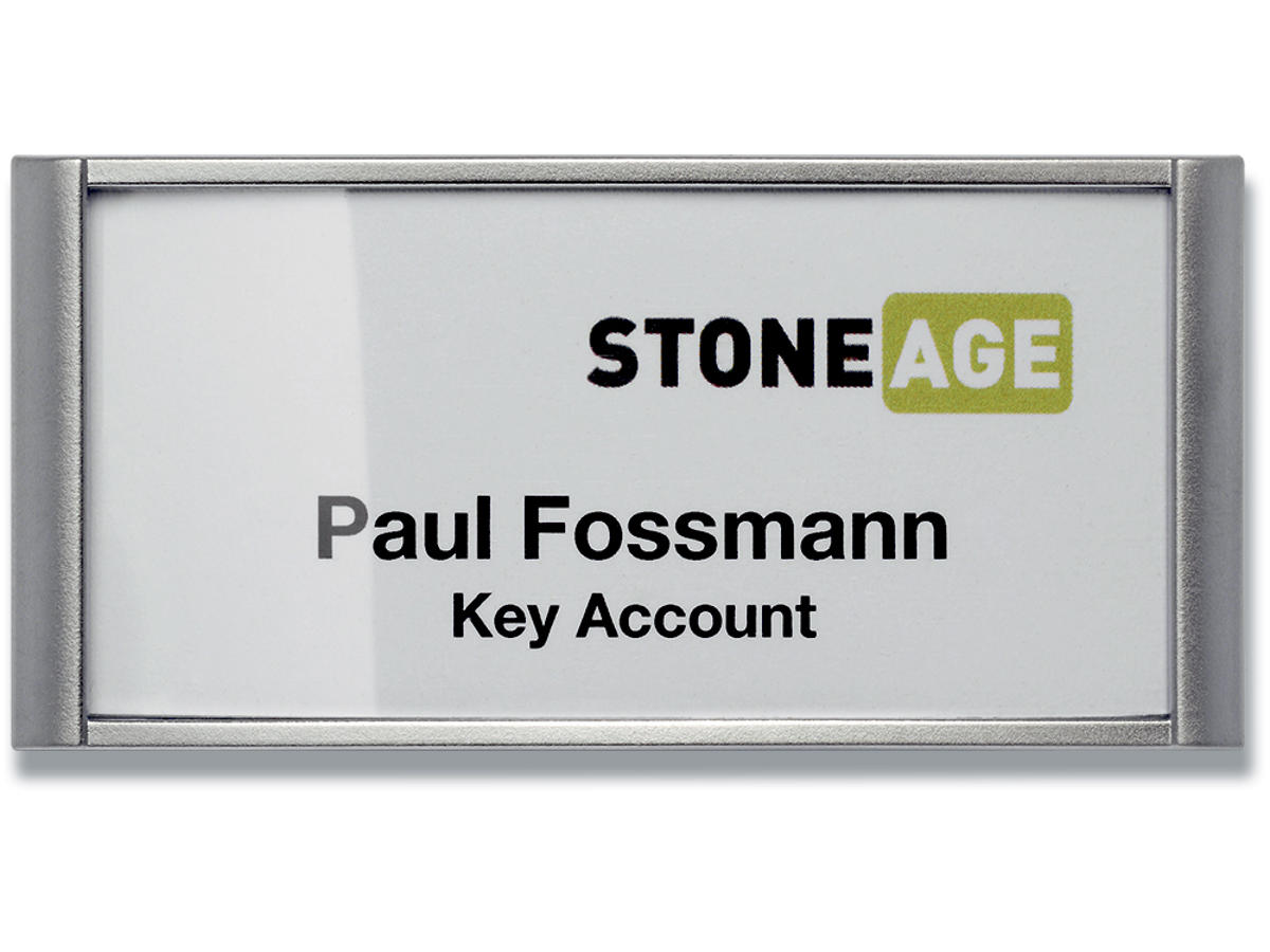 OBS må ikke anvendes af personer med pacemaker! Navneskilt CLASSIC med sølv finish og magnet 74x34mm (BxH). Denne højkvalitets navneskilt serie CLASSIC kombinerer højeste kvalitet, elegant design og holdbar funktionalitet. Perfekt til udstillinger, hotel og restauranter, butikker osv. Sidder sikkert på plads med den kraftige magnet, hvilket er en meget textilvenlig metode at fastgøre på. Fungerer også på sarte textiler. Indstik medfølger. Mål indstik: 74x34mm (BxH). Indstiksetiket på A4 ark til udskrivning i printer kan bestilles separat (Durable art nr 142502). Design selv en personlig designet kongressmærke med gratis skabelon - Klik her
