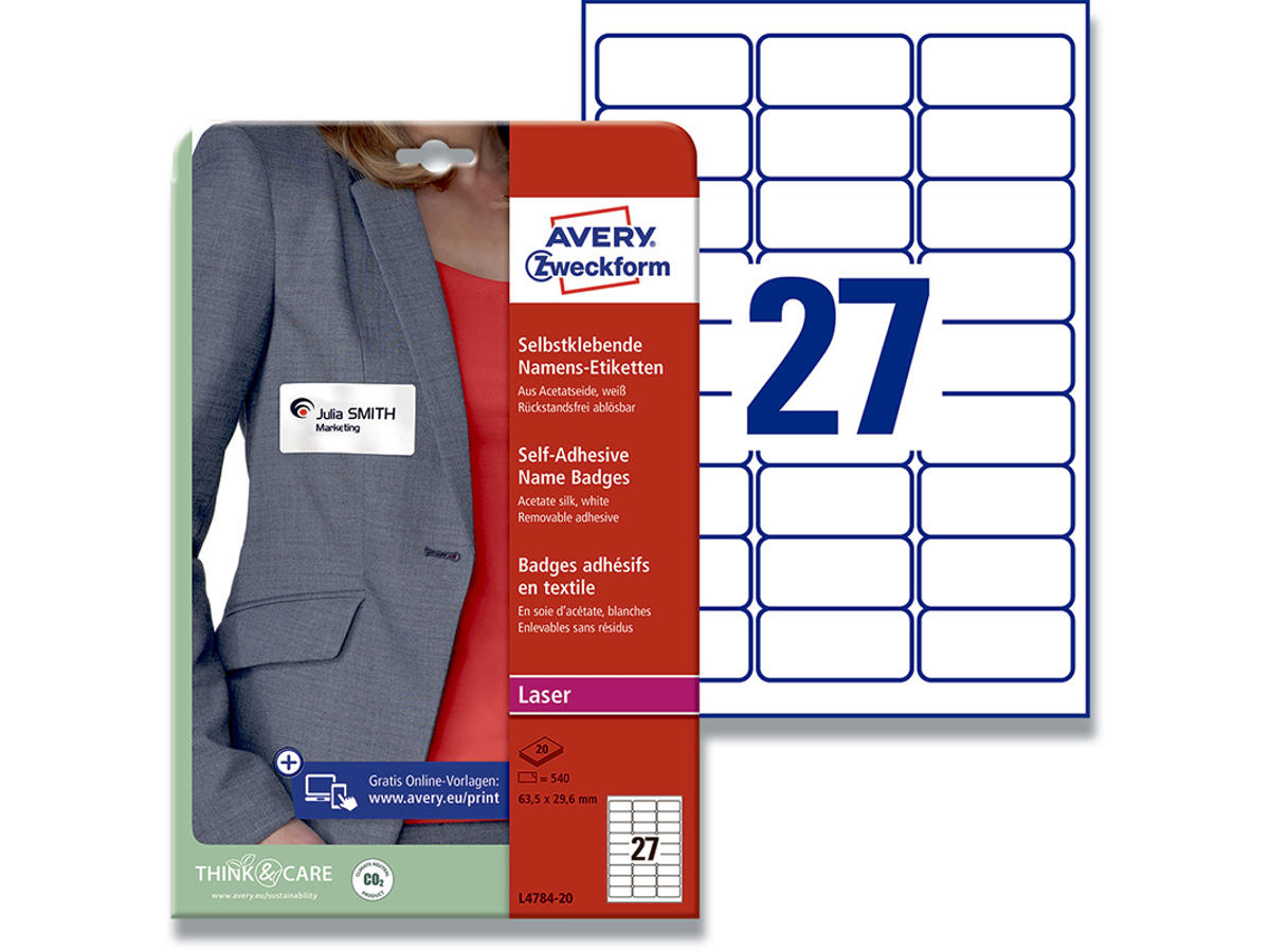 Som konference-koordinator og event manager kan du med Averys brede sortiment af miljøvenlige selvklæbende navneskilte på forhånd fremstille elegante og informative navneskilte til mødedeltagerne. Det letter check-in tiden, når deltagerne møder op og giver hurtigt overblik under mødet, seminaret eller konferencen. Det vil samtidige være med til at skabe en professionel stemning og indtryk – for hvem har ikke prøvet at deltage på et møde, hvor alt energi i de indlagte pauser bliver brugt på at granske sin hjerne i forhold til, hvem det er, man står og taler med. Med de selvklæbende navneskilte er nemt at printe navn mv., så det tydeligt kan ses og læses – og man kan koncentrere sig om samtalen. Har du brug for et navneskilt i en fart til en ekstra mødedeltagere? Fortvivl ikke, navneetiketterne er også til håndskrivning, du kan bruge en permanent marker. Avery's L4784-20 selvklæbende navneskilte har 27 navneetiketter/ark og 540 navneetiketter/pk, hvor hver etiket måler 63,5 x 29,6. Den lille navneetiket gør dem velegnet til de mest nødvendige oplysninger som navn og firma. Navneetiketten er fremstillet i et PVC-frit silkemateriale, som giver et flot og eksklusivt look. Etiketterne klæber på alle tekstiler undtagen sarte tekstiler som silke, fløjl mv. De kan naturligvis fjernes igen uden at de efterlader mærker på tøjet. Navneetiketterne er nemme at skille fra hinanden på det printede ark, hvilket giver en stor tidsbesparende, ved sortering og distribution af navneskilte til store arrangementer. Etiketterne kan printes i alle laser- og farvelaserprintere. Du kan nemt og helt gratis designe og printe dine Avery produkter med vores software Avery Design & Print, hvor du finder skabeloner, grafik og designs - Klik her