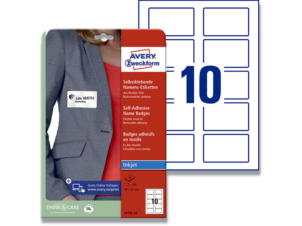 Som konference-koordinator og event manager kan du med Averys brede sortiment af miljøvenlige selvklæbende navneskilte på forhånd fremstille elegante og informative navneskilte til mødedeltagerne. Det letter check-in tiden, når deltagerne møder op og giver hurtigt overblik under mødet, seminaret eller konferencen. Det vil samtidige være med til at skabe en professionel stemning og indtryk – for hvem har ikke prøvet at deltage på et møde, hvor alt energi i de indlagte pauser bliver brugt på at granske sin hjerne i forhold til, hvem det er, man står og taler med. Med de selvklæbende navneskilte er nemt at printe navn mv., så det tydeligt kan ses og læses – og man kan koncentrere sig om samtalen. Har du brug for et navneskilt i en fart til en ekstra mødedeltagere? Fortvivl ikke, navneetiketterne er også til håndskrivning, du kan bruge en permanent marker. Avery's J4785-20 selvklæbende navneskilte har 10 navneetiketter/ark og 200 navneetiketter/pk, hvor hver etiket måler 80 x 50 mm, hvilket gør dem velegnet til oplysninger som navn, firma og logo. Navneetiketten er fremstillet i et PVC-frit silkemateriale, som giver et flot og eksklusivt look. Etiketterne klæber på alle tekstiler undtagen sarte tekstiler som silke, fløjl mv. De kan naturligvis fjernes igen uden at de efterlader mærker på tøjet. Navneetiketterne er nemme at skille fra hinanden på det printede ark, hvilket giver en stor tidsbesparende, ved sortering og distribution af navneskilte til store arrangementer. Etiketterne kan printes i alle inkjetprintere. Du kan nemt og helt gratis designe og printe dine Avery produkter med vores software Avery Design & Print, hvor du finder skabeloner, grafik og designs - Klik her