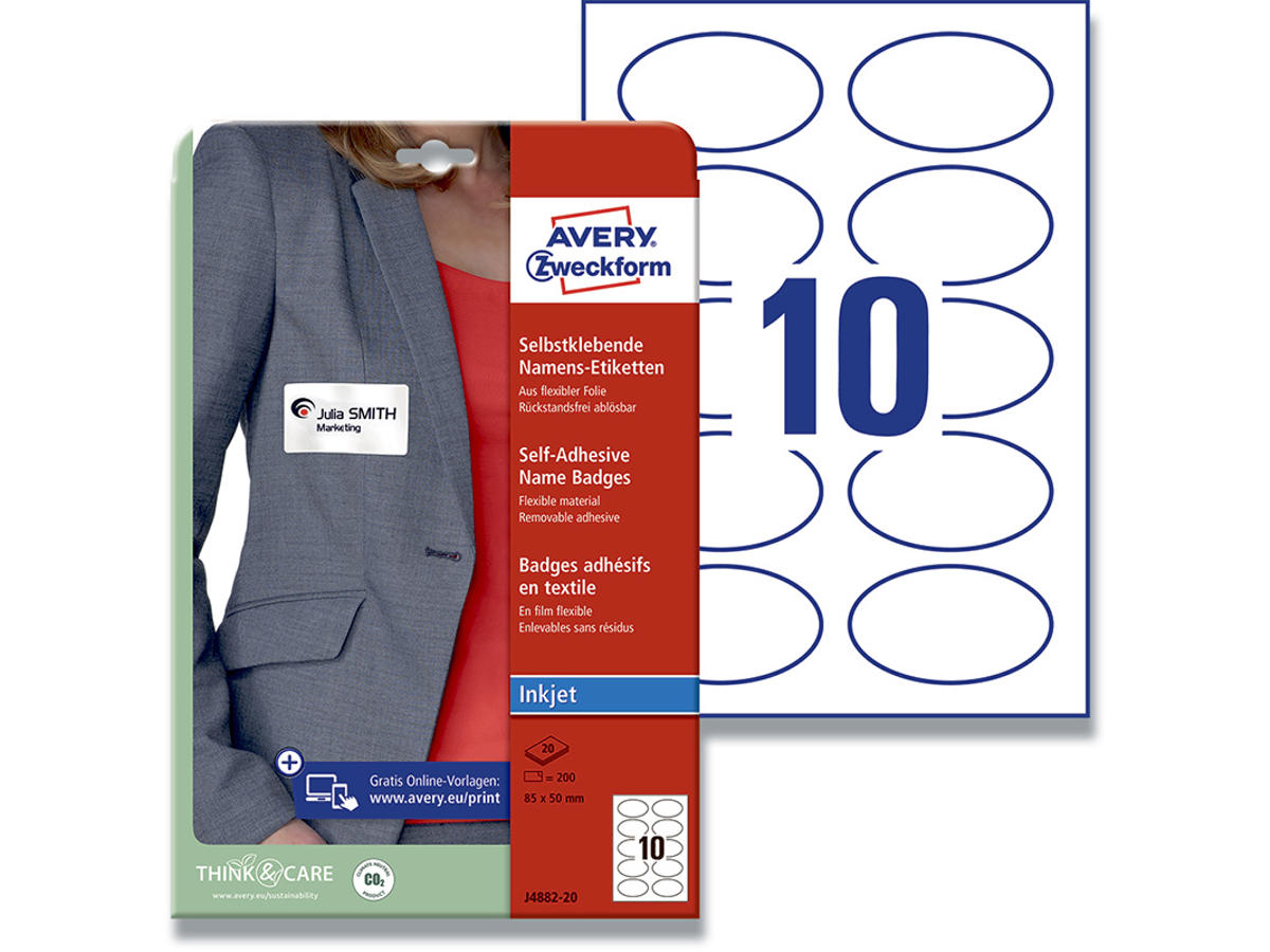 Navneskilt, Klæbes på tøj, 85x50 mm, 200 stk, Avery Selvklæbende til tekstil