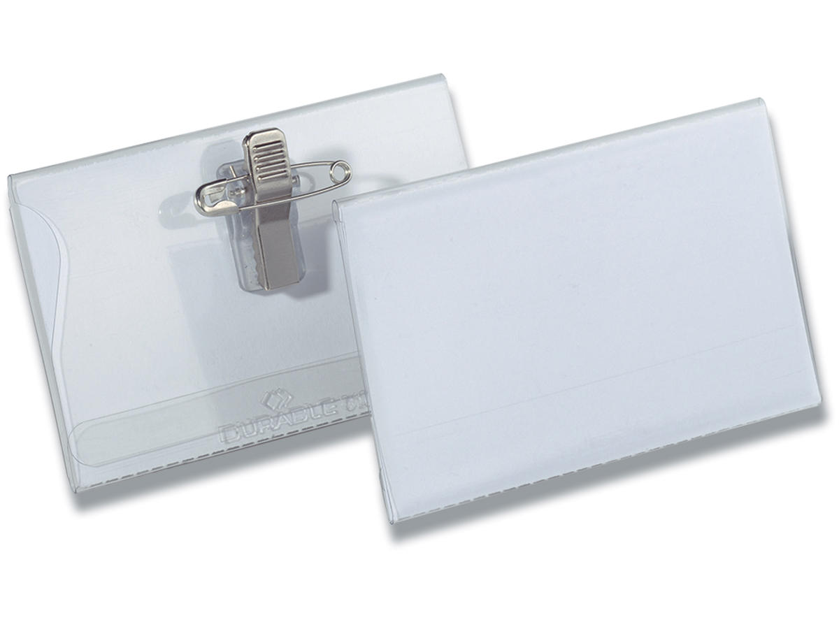 Navneskilt, Med klemme, sikkerhedsnål og indstik, 54x90 mm, 50 stk, Durable