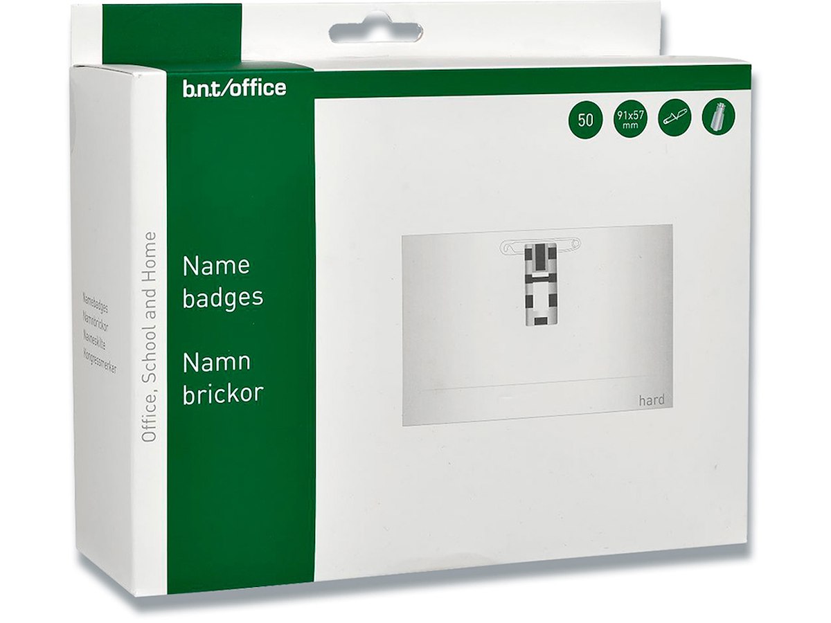 Navneskilt, Med klemme, sikkerhedsnål og indstik, 57x91 mm, 1 stk, BNT Office