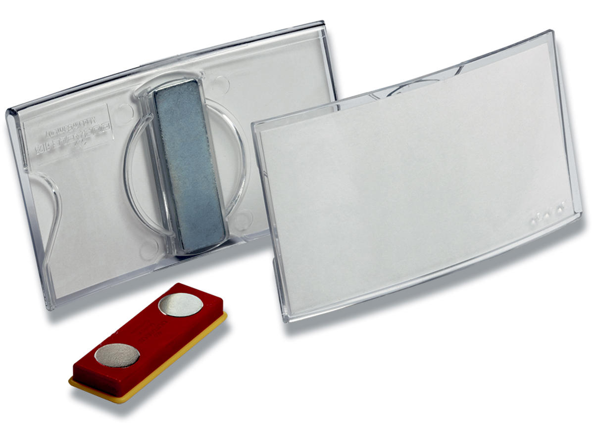 Støbt konveks akryl navne badge. Den konvekse form holder sikkert badgeindsatsen på plads. Dobbeltmagnet sikrer sikker positionering. Vær opmærksom på, at personer med pacemakere ikke bør bruge denne badge. Mål: 40x75 mm (BxH)