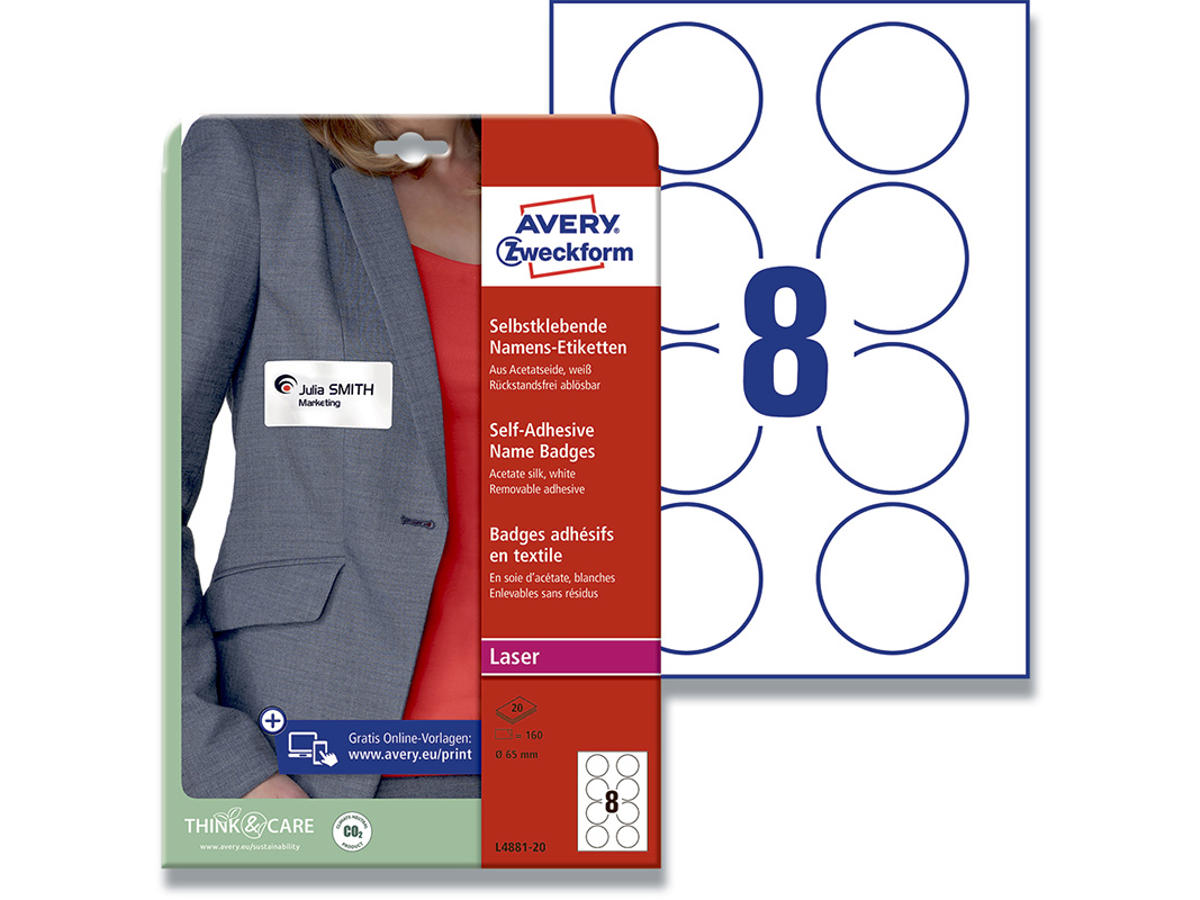 Avery's L4881-20 selvklæbende navneskilte har 8 navneetiketter/ark og 160 navneetiketter/pk. De er runde med diameter på 65 mm. Der er plads til de mest gængse oplysninger som navn, firma og logo. Navneetiketten er fremstillet i et PVC-frit silkemateriale, som giver et flot og eksklusivt look.