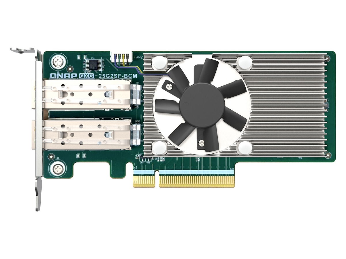 QNAP QXG-25G2SF-BCM. Intern. Forbindelsesteknologi: Ledningsført, Værtsgrænseflade: PCI Express, Grænseflade: Fiber. Maksimal dataoverførselshastighed: 25000 Mbit/s. Produktfarve: Sølv, Mørkegrøn