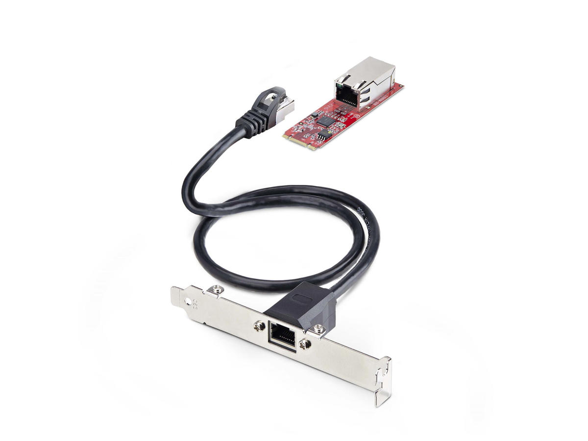 The network adapter card connects to an available M.2 2280 PCIe slot (B or M key compatible). Standard and low-profile brackets and a 2ft (60cm) Cat6 adapter cable are included for versatile installation. Compatible with Windows, and Linux.