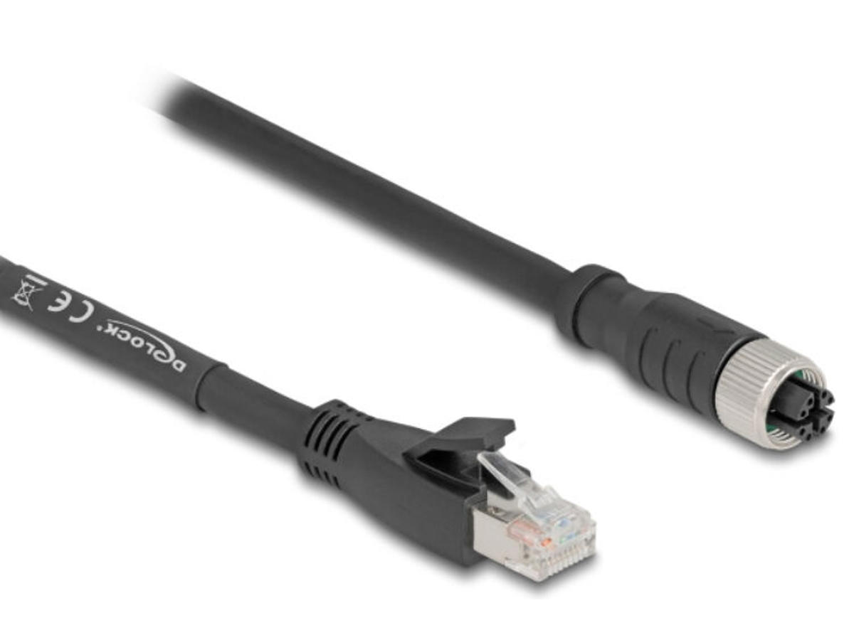 DeLOCK 80591. Kabellængde: 3 m, Standard for kabler: Cat5e, Kabelafskærmning: S/FTP (S-STP), Stik 1: M12, Stik 2: RJ-45, Produktfarve: Sort