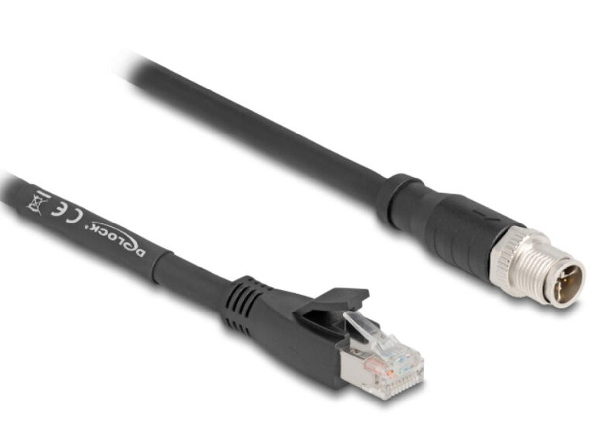 DeLOCK 80579. Kabellængde: 2 m, Standard for kabler: Cat5e, Kabelafskærmning: S/FTP (S-STP), Stik 1: M12, Stik 2: RJ-45, Produktfarve: Sort