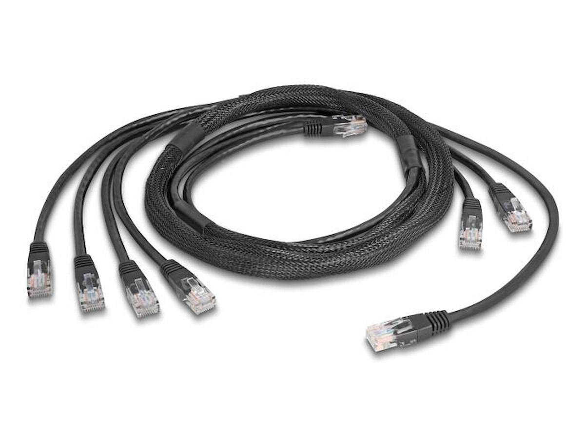 DeLOCK 90121. Kabellængde: 5 m, Standard for kabler: Cat5e, Kabelafskærmning: U/UTP (UTP), Stik 1: 4 x RJ-45, Stik 2: 4 x RJ-45, Produktfarve: Sort