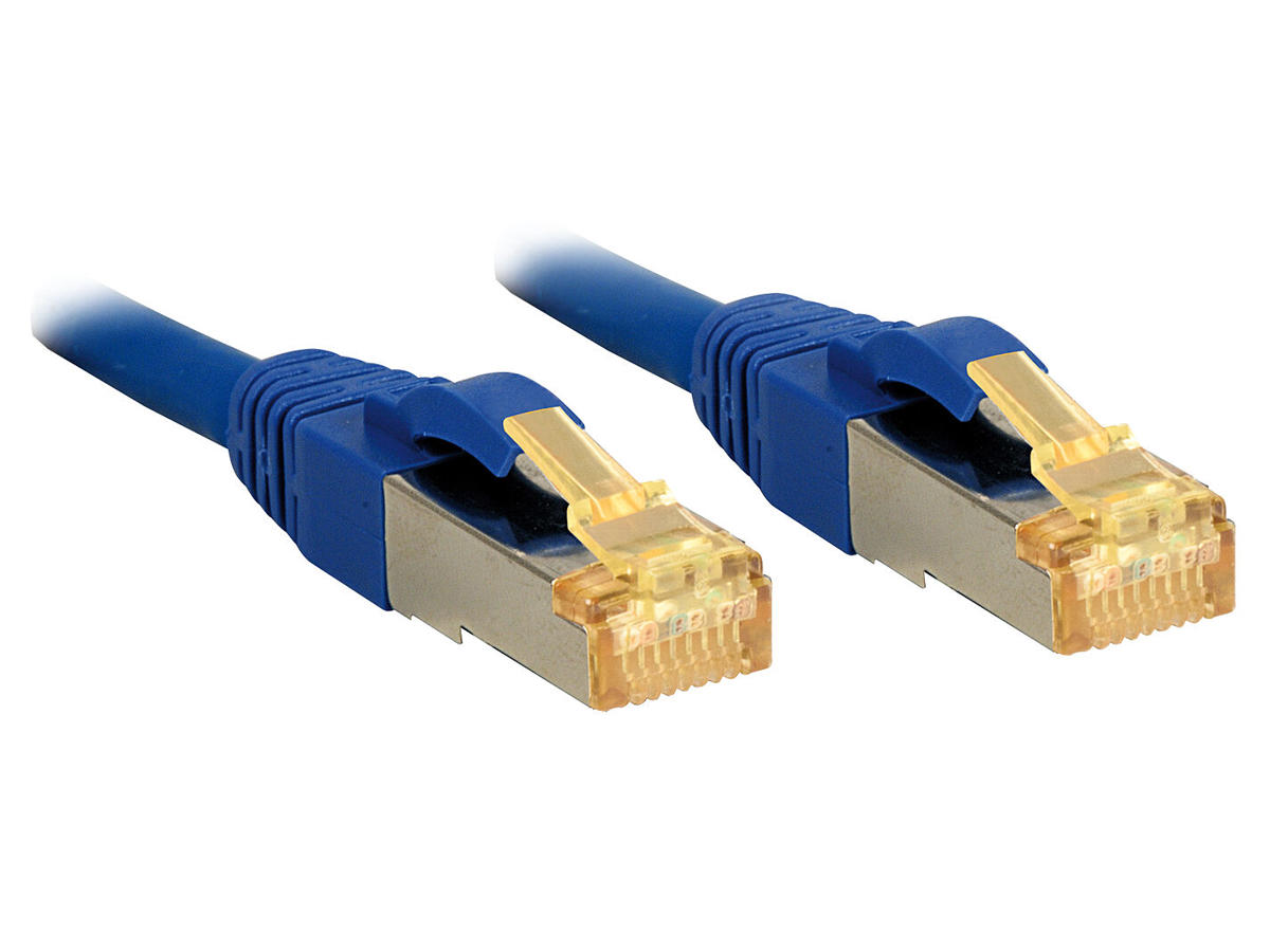 Cat.7 S/FTP LSZH network cable with Cat.6A connectors supports bandwidth up to 600MHz and features a snagless design with gold plated contacts for ethernet standards up to 10 GBase-T.