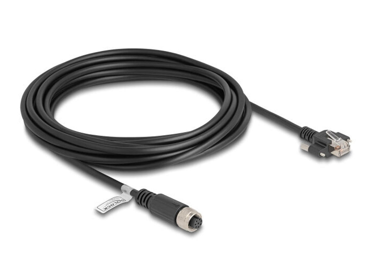 DeLOCK 80430. Kabellængde: 5 m, Standard for kabler: Cat5e, Kabelafskærmning: F/UTP (FTP), Stik 1: M12, Stik 2: RJ-45, Produktfarve: Sort