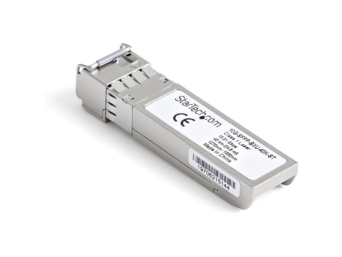 The 10G-SFPP-BXU-40K-ST is a Brocade 10G-SFPP-BXU-40K compatible upstream fiber SFP transceiver which pairs with StarTech.com's 10G-SFPP-BXD-40K-ST. They are designed, programmed and tested to work with 10GBASE-BX compatible Brocade switches and routers. The SFP+ transceiver module supports a maximum distance of up to 40 km (24.8 mi) and delivers dependable 10 GbE connectivity over fiber cabling.