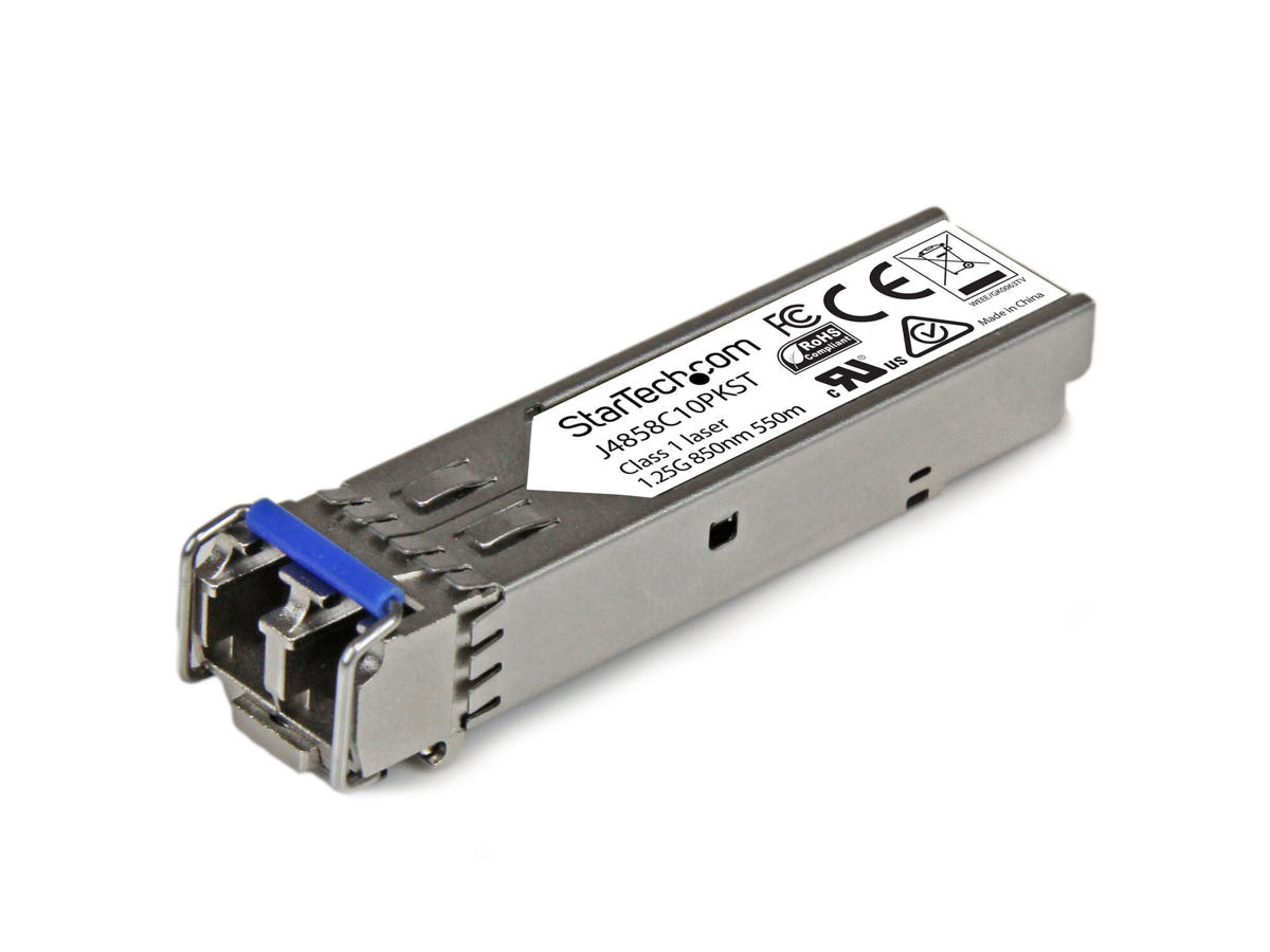 The J4858C10PKST is a ten-pack of our HPE J4858C compatible fiber transceiver module that has been designed, programmed and tested to work with HPE® brand switches and routers. It delivers dependable 1 GbE connectivity over fiber cable, for 1000BASE-SX compliant networks, with a maximum distance of up to 550 m (1804 ft).
