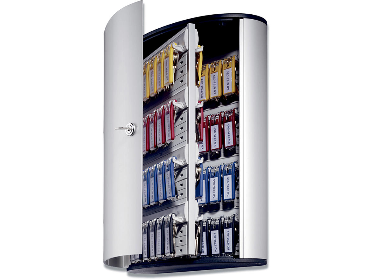 Nøgleskab i aluminium til 72 stk. nøgler. Leveres med cylinderlås og to nøgler samt skruer til montering. Med overskuelig indholdsfortegnelse, som gør det nemt at finde den rigtige nøgle. Nøglekrogen kan placeres i flere forskellige højder for at tilpasses efter behov. Praktisk nøglering der hænger fast på sin plads, på den specialdesignet nøglekrog. Enkelt at fastgøre og flytte. Nøgleringens etiket kan nemt markeres, hvilket gør det hele overskueligt og nemt at holde styr på sine nøgler. Inklusiv 1 sæt med 6 stk. nøgleringe (Durable art nr 1957) i rød, gul, blå og sort. Mål 400 x 302 x 118 mm. (HxBxD).