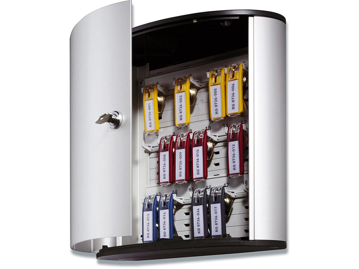 Nøgleskab i aluminium til 18 stk. nøgler. Leveres med cylinderlås og to nøgler samt skruer til montering. Med overskuelig indholdsfortegnelse, som gør det nemt at finde den rigtige nøgle. Nøglekrogen kan placeres i flere forskellige højder for at tilpasses efter behov. Praktisk nøglering der hænger fast på sin plads, på den specialdesignet nøglekrog. Enkelt at fastgøre og flytte. Nøgleringens etiket kan nemt markeres, hvilket gør det hele overskueligt og nemt at holde styr på sine nøgler. Inklusiv 1 sæt med 6 stk. nøgleringe (Durable art nr 1957) i rød, gul, blå og sort. Mål 280 x 302 x 118 mm. (HxBxD).