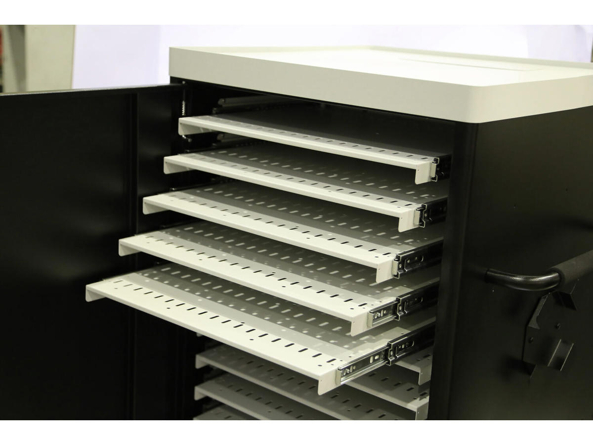 NoteCart UniFit is a mobile cabinet for storing and charging laptops, Chromebooks and similar devices on 16 sliding shelves.