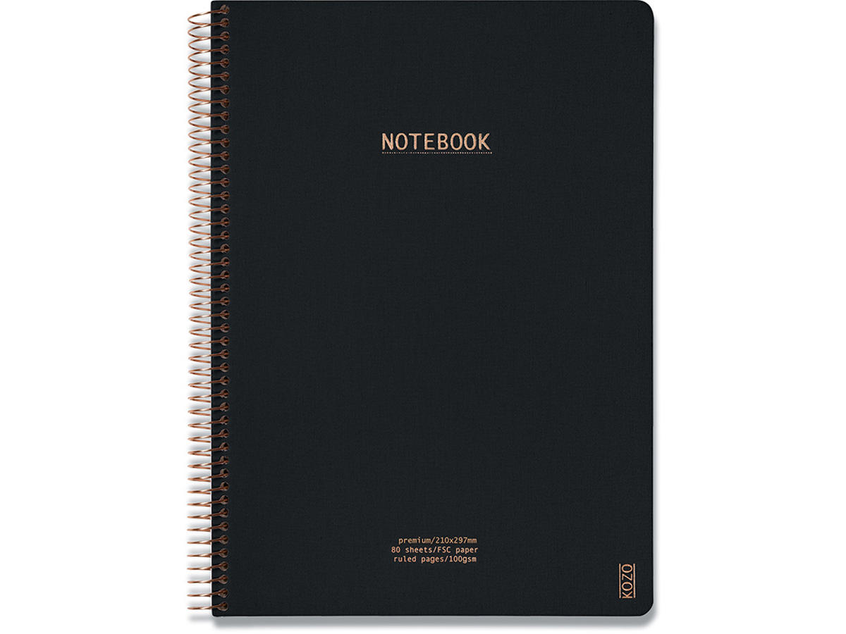 KOZO Premium notebook er absolut en af de flotteste notebooks på markedet. Det robuste lærredsbetræk med smukke detaljer i bronze og den frække store spiral, også i bronze, gør den perfekt til at skrive og tage noter i, både når du har den liggende på skødet eller endda stående uden støtte. Og selvfølgelig en smuk indretningsdetalje til dit skrivebord. At skrive på det cremefarvede 100 g papir giver en luksuriøs følelse. Alle 80 ark i notesbogen har en datolinje øverst til højre, enkelt og praktisk. Passer til alle andre KOZO skrivebordsartikler i samme farvenuancer.