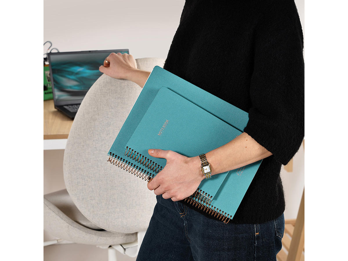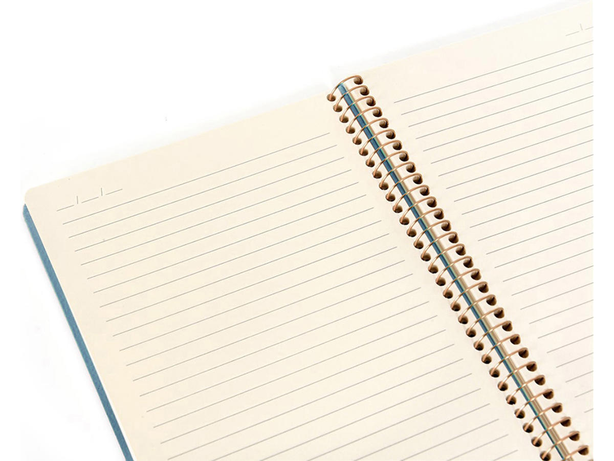 KOZO Premium notebook er absolut en af de flotteste notebooks på markedet. Det robuste lærredsbetræk med smukke detaljer i bronze og den frække store spiral, også i bronze, gør den perfekt til at skrive og tage noter i, både når du har den liggende på skødet eller endda stående uden støtte. Og selvfølgelig en smuk indretningsdetalje til dit skrivebord. At skrive på det cremefarvede 100 g papir giver en luksuriøs følelse. Alle 80 ark i notesbogen har en datolinje øverst til højre, enkelt og praktisk. Passer til alle andre KOZO skrivebordsartikler i samme farvenuancer.
