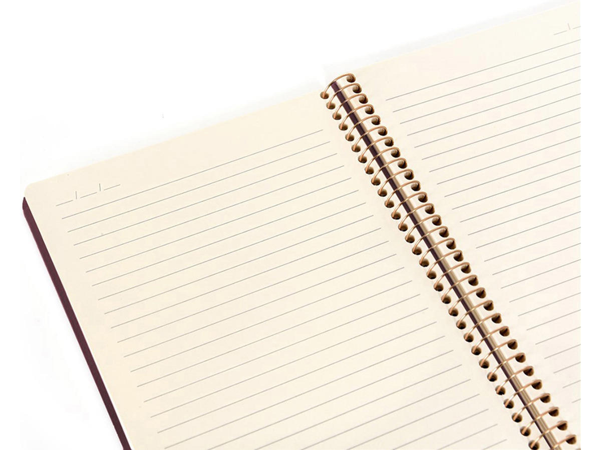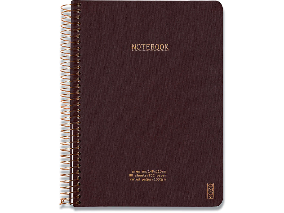 KOZO Premium notebook er absolut en af de flotteste notebooks på markedet. Det robuste lærredsbetræk med smukke detaljer i bronze og den frække store spiral, også i bronze, gør den perfekt til at skrive og tage noter i, både når du har den liggende på skødet eller endda stående uden støtte. Og selvfølgelig en smuk indretningsdetalje til dit skrivebord. At skrive på det cremefarvede 100 g papir giver en luksuriøs følelse. Alle 80 ark i notesbogen har en datolinje øverst til højre, enkelt og praktisk. Passer til alle andre KOZO skrivebordsartikler i samme farvenuancer.