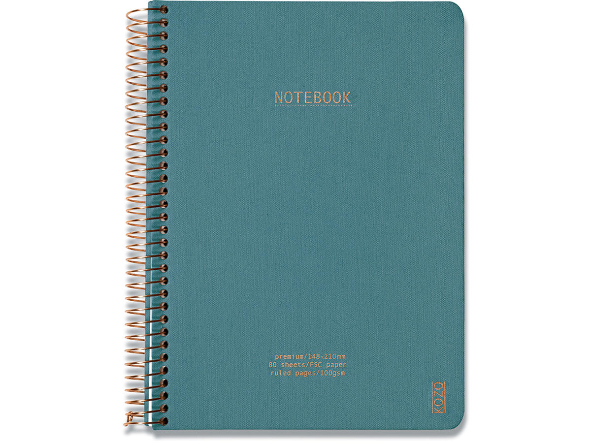 KOZO Premium notebook er absolut en af de flotteste notebooks på markedet. Det robuste lærredsbetræk med smukke detaljer i bronze og den frække store spiral, også i bronze, gør den perfekt til at skrive og tage noter i, både når du har den liggende på skødet eller endda stående uden støtte. Og selvfølgelig en smuk indretningsdetalje til dit skrivebord. At skrive på det cremefarvede 100 g papir giver en luksuriøs følelse. Alle 80 ark i notesbogen har en datolinje øverst til højre, enkelt og praktisk. Passer til alle andre KOZO skrivebordsartikler i samme farvenuancer.
