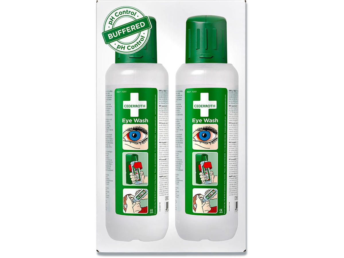 Cederroth Øjenskyl i 2-pack Funktionelt design og gode skylleegenskaber. En let håndterlig flaske med ergonomisk øjenkop og ordentlig væskestrømning. Hurtig og enkel at åbne: Åbnes blot med ét enkelt håndgreb. Vrid og flasken er åbnet. Indhold: 2 flasker x 500 ml steril bufret isoton saltvandsopløsning uden konserveringsmiddel. Til engangsbrug. Holdbarhed 4,5 år. Mål: Ø 6,6 cm x 23,5 cm