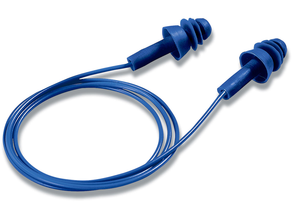 Genanvendelig detektérbare ørepropper, vaskbare, den blå farve muliggør let genkendelse i produktionsområder.