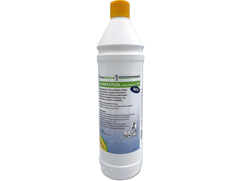 Prime Source Ren 85 desinfektion er et klar til brug desinficerende middel, som indeholder ethanol. Fordi desinficeringen indeholder ethanol fordamper produktet hurtigt og efterlader en helt tør overflade, uden behov for efterskylning.