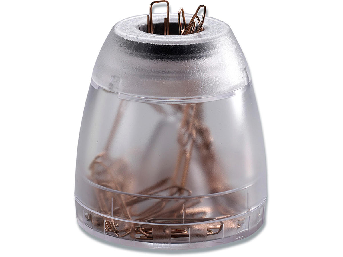 Rund magnetisk clipsholder. Aftagelig bund for genopfyldning. Æske med 100 clips medfølger. Mål: ø72 mm. Højde 75 mm.