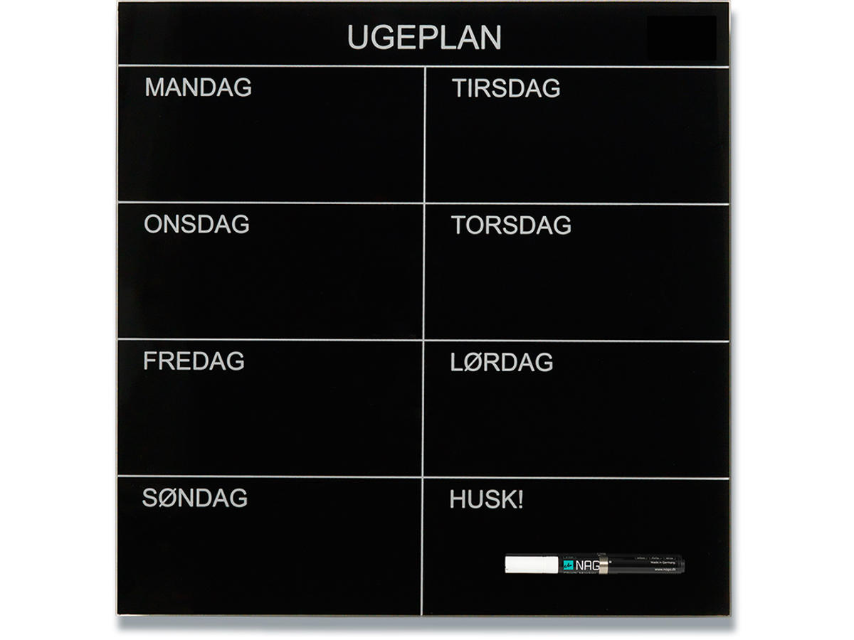 Naga 45 x 45 cm. Sort. Glas uge tavle Dansk
