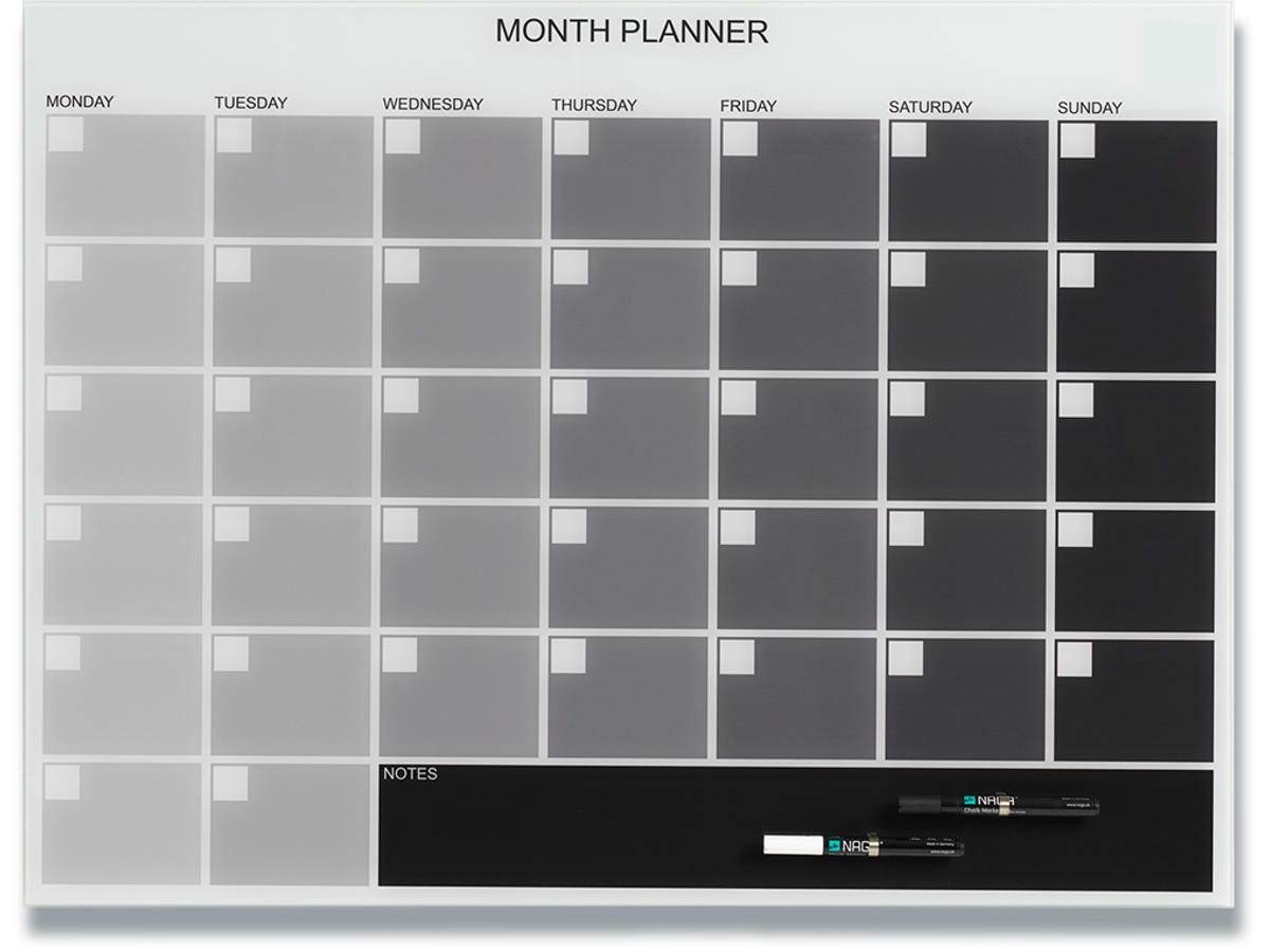Magnetisk glas måneds tavle 80 x 60 cm. Grå nuancer. Engelsk tekst. Skriv på tavlen med en marker, og sæt ting op på den med super stærke magneter. Gør det nemt at planlægge månedens aktiviteter.