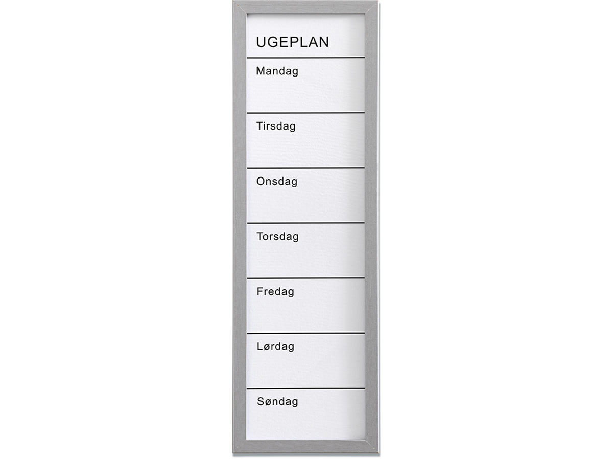 Whiteboard ugetavle 20 x 60 cm. Hvid med sølv farvet MDF ramme. Dansk tekst. Gør det nemt at planlægge ugens aktiviteter. Skriv på tavlen med en marker. Tavlen viskes ren med en almindelig tavlesvamp, evt. sammen med vores tavlerens. OBS: tavlen ikke bør rengøres med husholdningssprit, da det vil fjerne den faste tekst på tavlen.