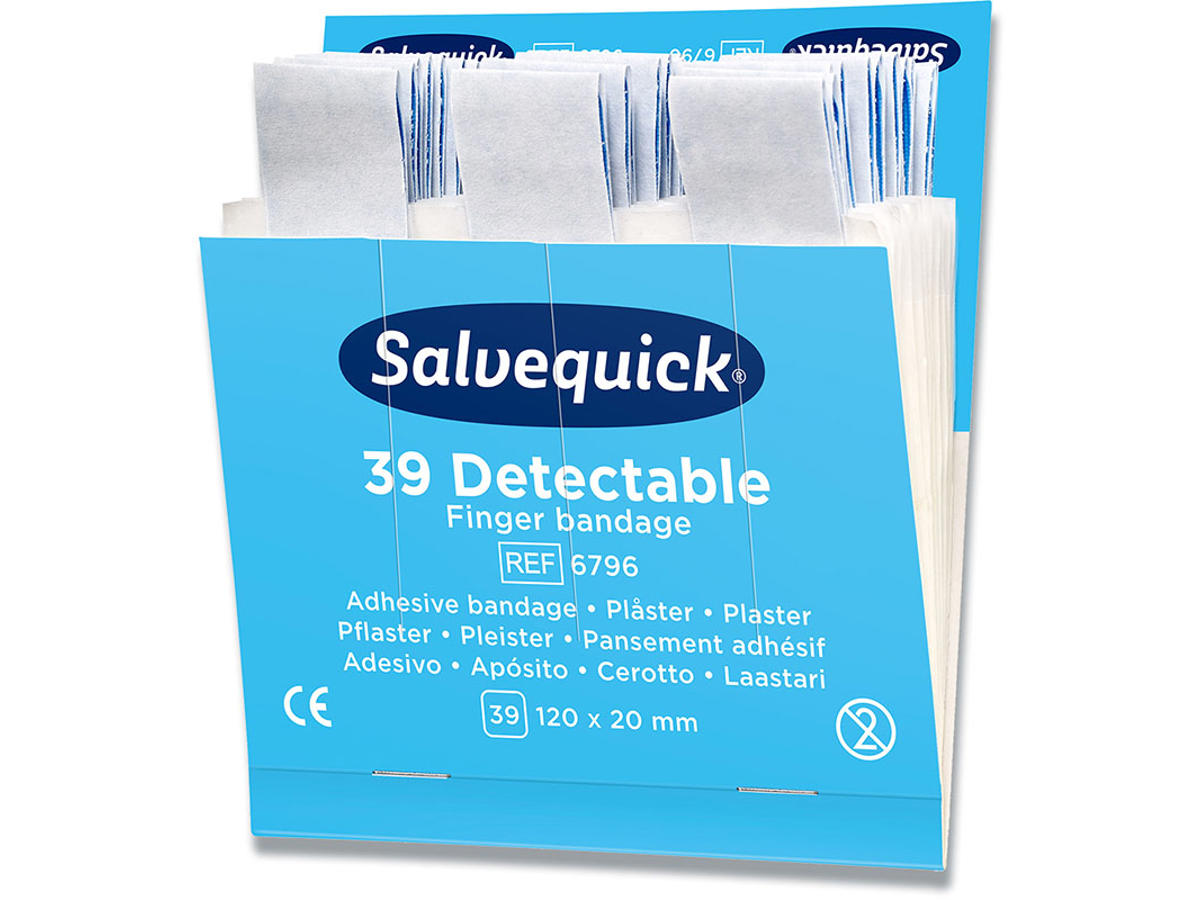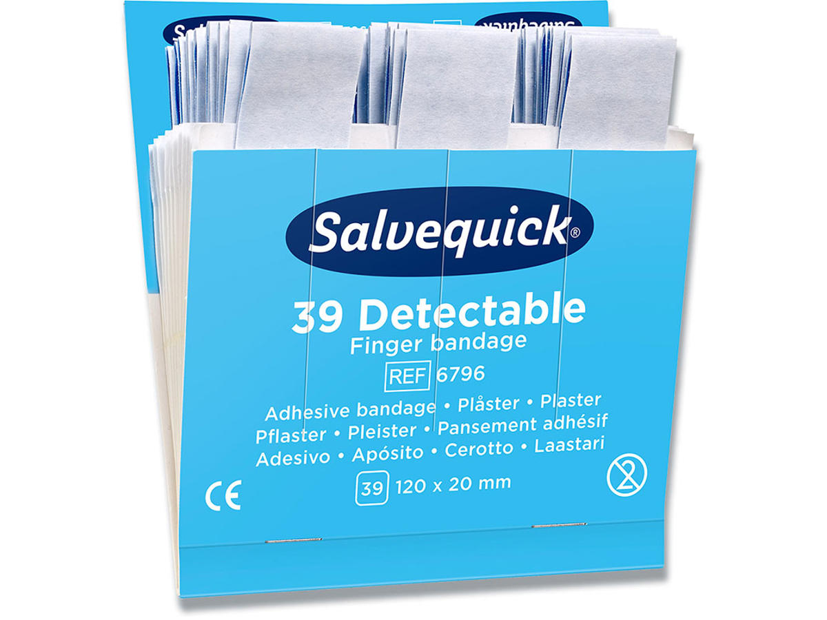 Blå Sporbare Extra Lange Fingerplastre. Salvequick blå plastre er specielt fremstillet til brug indenfor fødevareindustrien. Plastrene er sporbare og registreres af de fleste metaldetektorer. Den blå farve gør plastrene lette at se visuelt. Plastrene er allergitestede. De er bløde, fleksible og lette at anvende. INDHOLD: Hver refill indeholder 39 sterile plastre (120 x 120 mm) 6 refiller/æske.