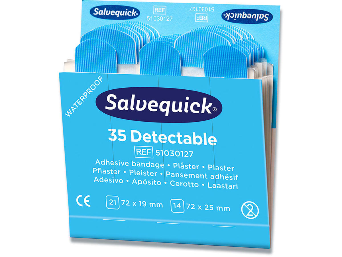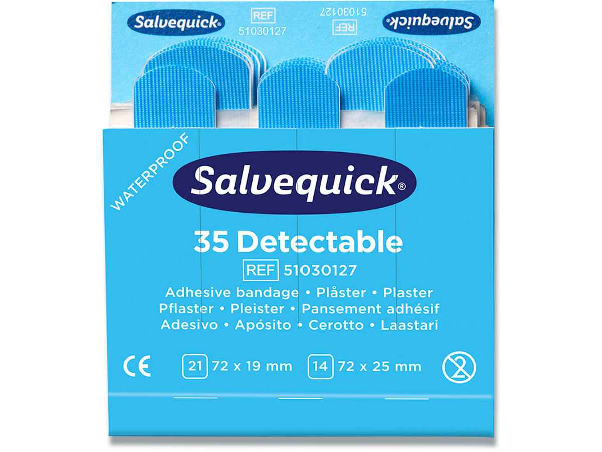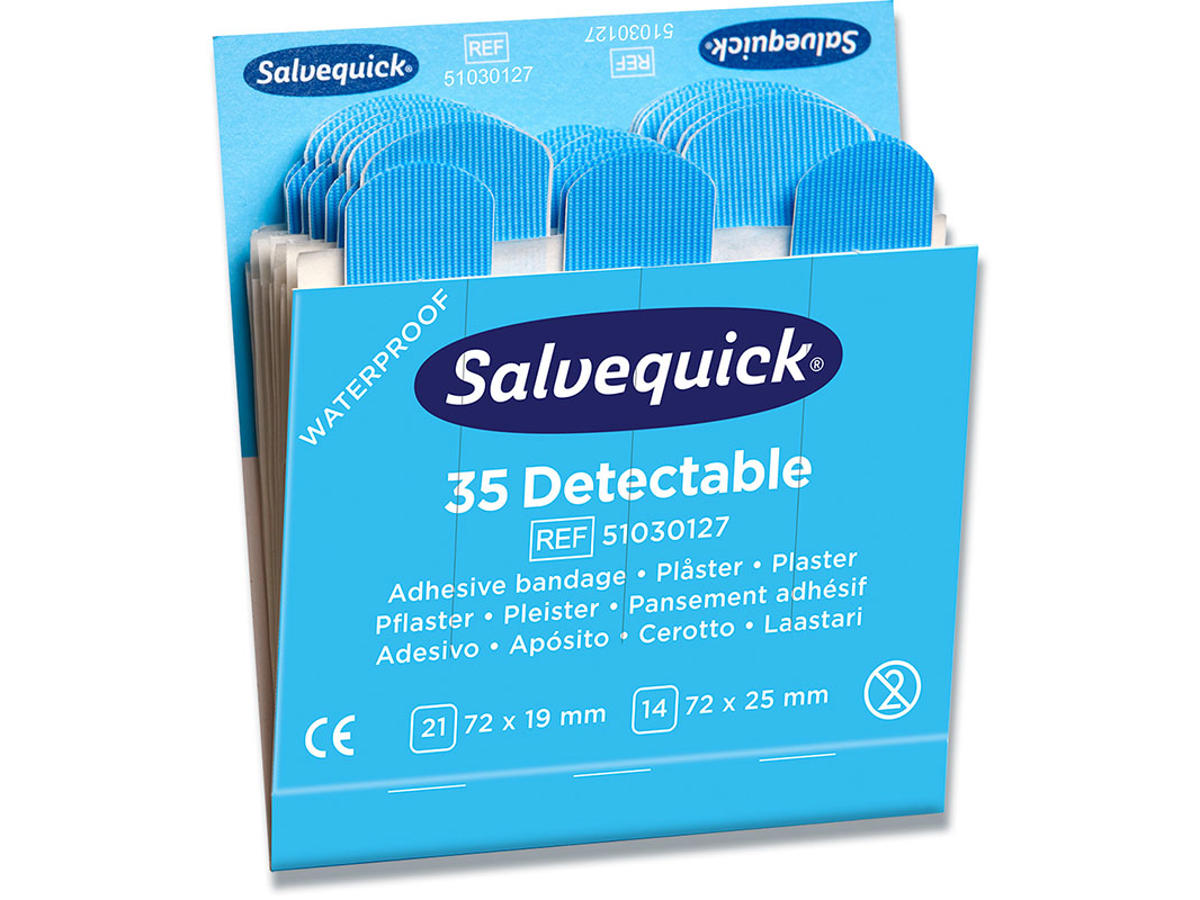 Blå, sporbare plastre, specielt designet til brug indenfor fødevareindustrien; Plastrene kan spores af de fleste metaldetektorer, som normalt anvendes her og den blå farve gør dem lette at se, Plastrene er allergitestede, lette at anvende og praktiske at bruge. INDHOLD: Hver refill indeholder 35 plastre (21 stk, der måler 72 x 19 mm, og 14 stk, der måler 72 x 25 mm).