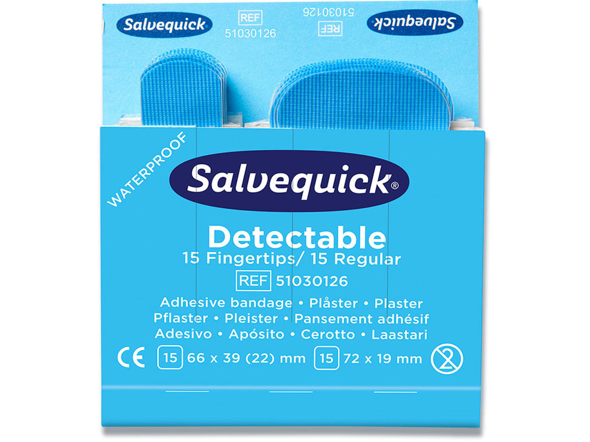 Blå, sporbare plastre, specielt designet til brug indenfor fødevareindustrien; Plastrene kan spores af de fleste metaldetektorer, som normalt anvendes her og den blå farve gør dem lette at se, Plastrene er allergitestede, lette at anvende og praktiske at bruge. INDHOLD: Hver refill indeholder 30 sterile plastre (15 stk, der måler 66 x 39 (22) mm, og 15 stk, der måler 72 x 19 mm).
