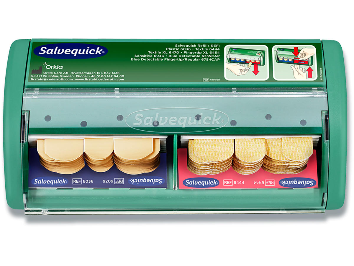 Salvequick Plasterdispenser og Plaster er et komplet og brugervenligt system. Plastrene er altid på plads, klar til brug. Refillerne er fastlåste, hvilket forhindrer svind. Indhold 40 tekstilplastre (REF 6444) og 45 plastplastre (REF 6036). Hver refill indeholder plaster i to størrelser: 72 x 19 mm og 72 x 25 mm. Mål: B 23 x H 12 x D 5,5 cm