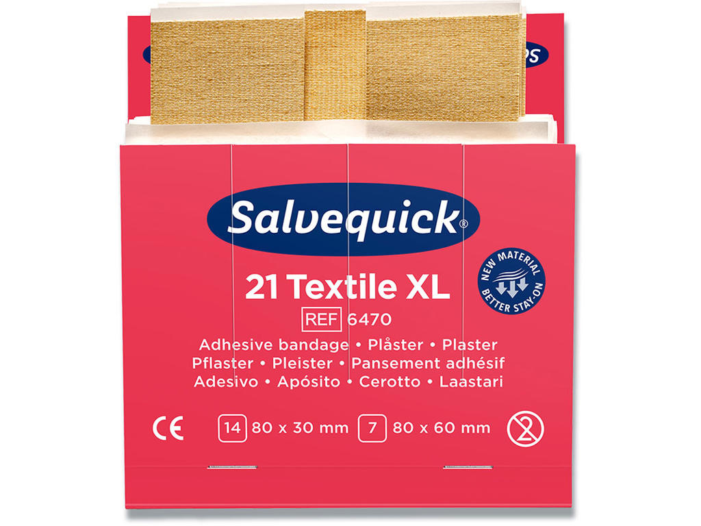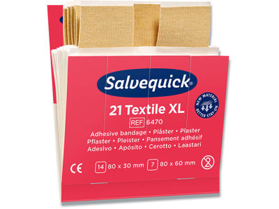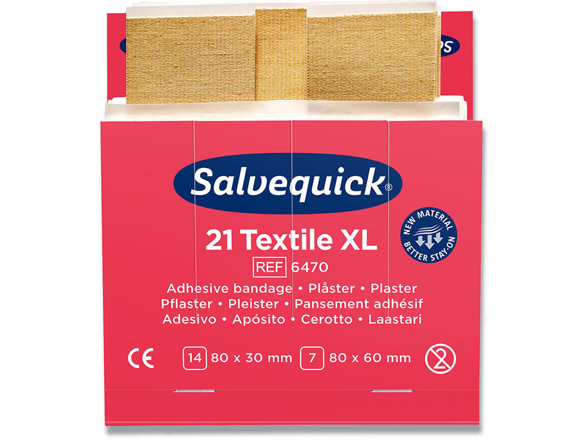 Plasterrefill till Salvequick plasterautomat (1907). Indhold: 21 plastre (14 stk. 80x32 mm og 7 stk. 80x48 mm). 6 refiller/æske. Salvequick ekstra stort tekstilplaster er ordentlige, lidt større plastre af høj kvalitet. De er allergitestede, lette at sætte på og fleksible og smidige at bruge.