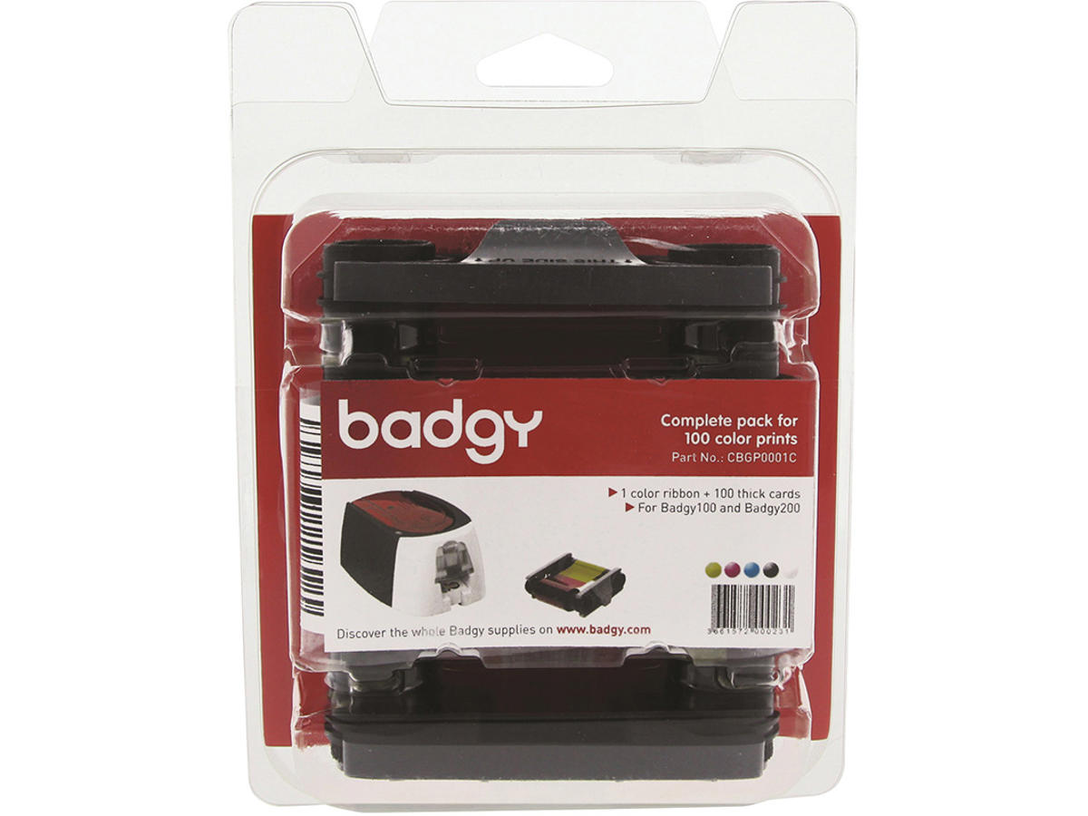 A YMCKO color ribbon consists of 5 panels. It contains the colors yellow (Y), magenta red (M), cyan blue (C), black (K) and overlay (O). The last field (O) is a protective layer of varnish that protects the printed elements on the card. The ribbons can print any design on either one or both sides of the card. Compatible with Badgy100 and Badgy200