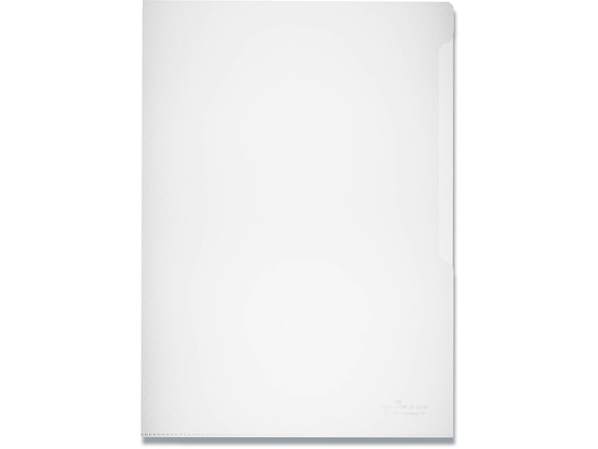 Standard plastomslag åben i højre side og i toppen, fremstillet af polypropylen, der består af mindst 95 % genbrugsmateriale fra produktions- og industriaffald. 100 mapper leveres i en bølgepapkasse, som er fremstillet af op til 80 % genbrugspapir. Fuldt ud genanvendeligt. Til dokumenter i A4-format. Mappens mål: 218x305 mm (BxH), tykkelse 0,10 mm